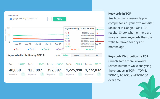 Google's top 1-100 information is provided to you for free by the extension. This way, it is easy for you to know for how many keywords your own site or your competitors' is ranked well in Google.